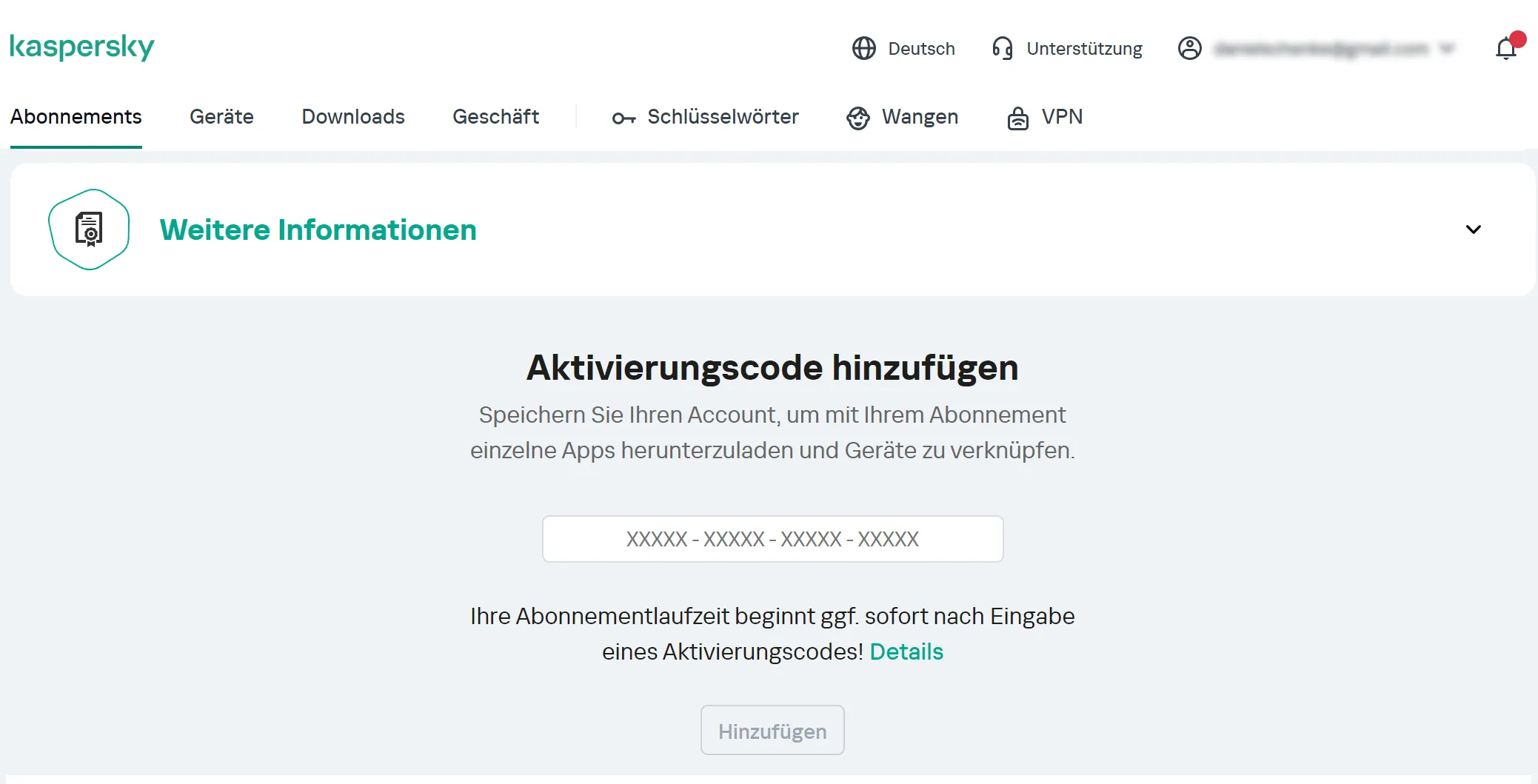 Geben Sie ihren neuen Aktivierungscode in das dafür vorgesehene Feld ein und klicken Sie auf hinzufügen.